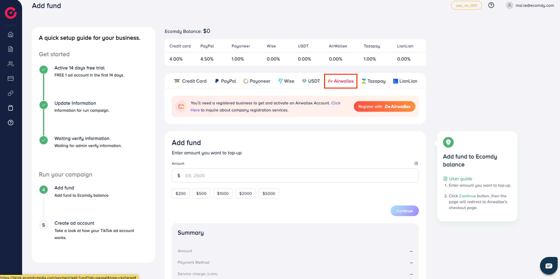 Via Airwallex, the service fee is 3% (14-day trial is 0%), tax is 3%, and gate fee is 0%. Please check the Summary to ensure you will send enough amount.